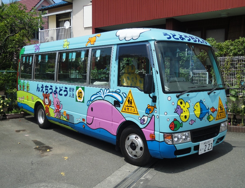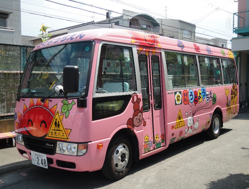 幼稚園を中心として、くじらバス(水色)、おひさまバス(ピンク)の2台の通園バスを運行しております。